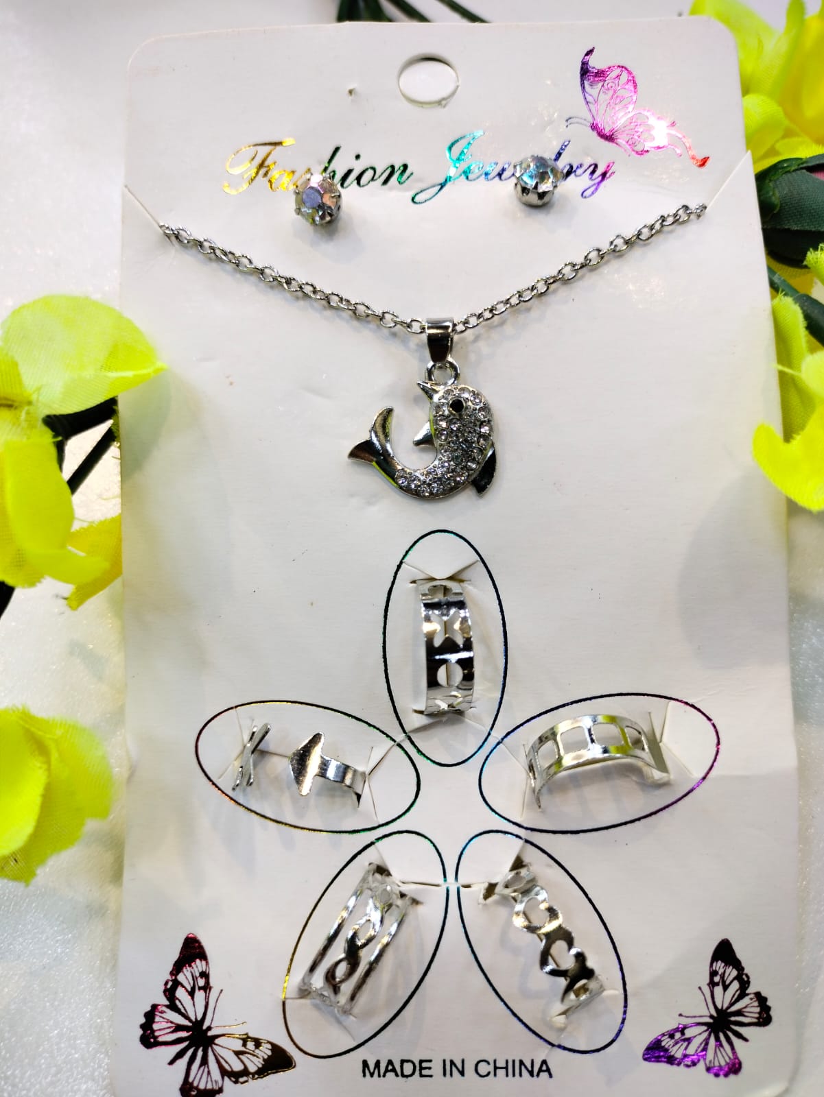 Jewelry Set Dolphin Silver includes : 1x Pendant, 1x Studs, 5x Rings